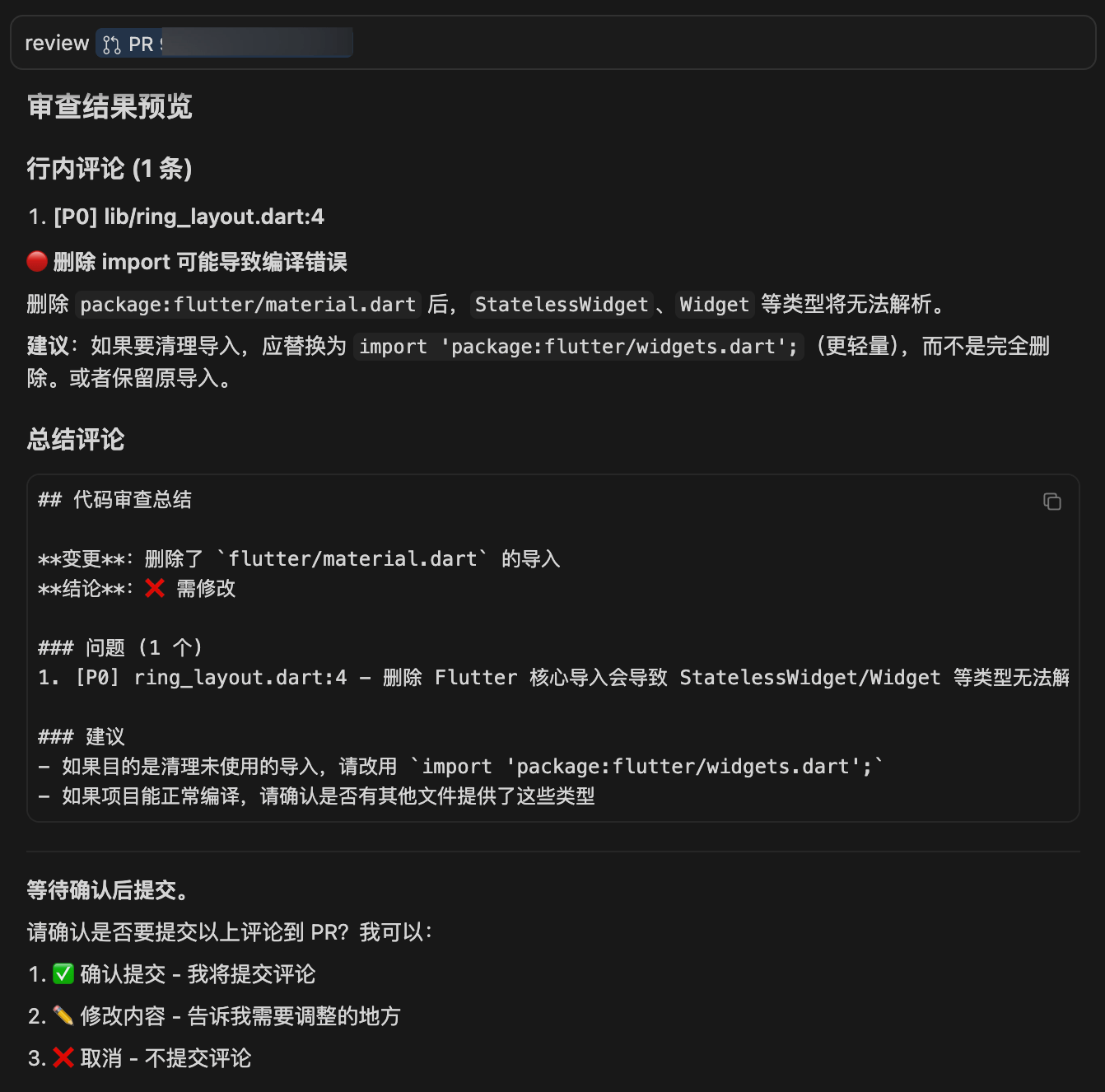 Review https://github.com/owner/repo/pull/123AI 会自动调用 MCP 工具获取 PR 信息和代码变更,然后按照规则进行审查,审查完成后会展示所有评论供确认: