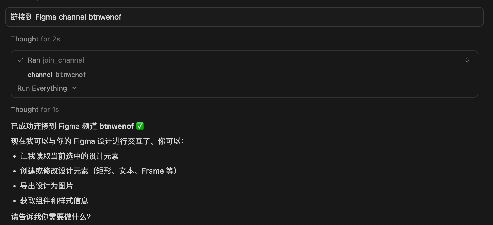 配置完成后,在 Cursor 的 Chat 里就能直接和 Figma 设计稿交互了。